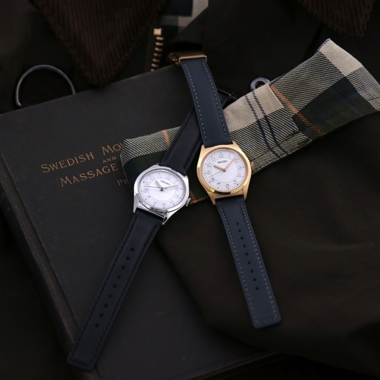 レディースにオススメな2モデル。左は現行では他にないステンレスのメッシュバンドを採用したモデル。うっすらとピンクがかった文字盤が特徴の華やかな一本。右はイエローゴールドと暗いブラウンのレザーを組み合わせたソーラーモデル。キレイ目な大人っぽいスタイリングとの相性がよく、週末のお出かけでも活躍してくれること間違いなし。