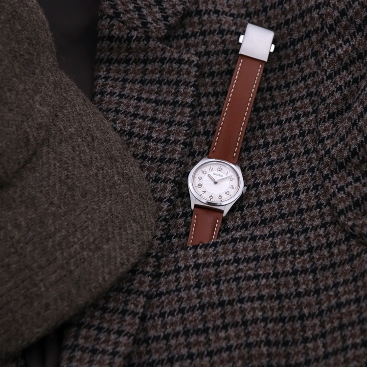 ライトブラウンの温かみのあるレザーにホワイトのステッチが施されたモデル。グレーベージュの文字盤がヴィンテージウォッチを思わせる質感。トラッドなスタイルとの合わせが抜群。暗めな色を選びがちなメンズにぜひお試しいただきたい一本です。