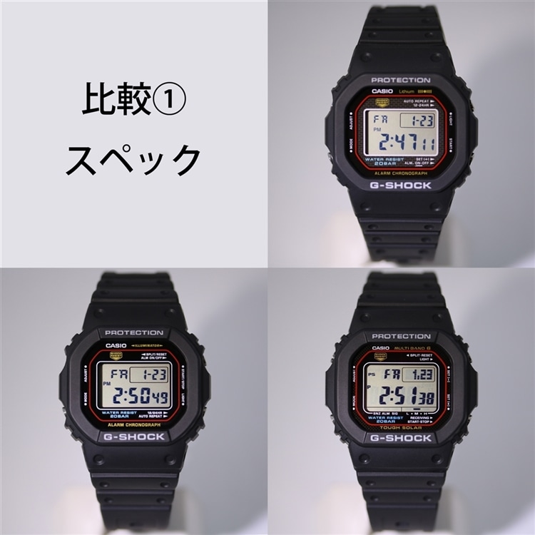 まずはわかりやすくスペックから比較してみましょう。前提として「DW-5000R(右上)」と「DW-5600RL(左下)」はクォーツ(電池式)、「GW-M5610U(右下)」はタフソーラー(太陽光充電システム)です。クォーツは最新のモデルということもあり電池寿命約5年かつバイオマスプラスチックを使用しています。ソーラーは充電池寿命が約10年※ほど、ケースやバンドは通常の樹脂素材です。