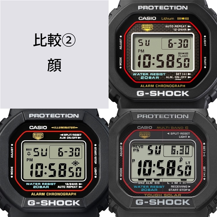 お次は顔、デジタルフェイスのデザインです。どれもベースは初代「DW-5000C」を継承していることもあり、かなりソックリです。特徴的な7セグメントフォントや、ブランドカラーでもあり挑戦し続ける情熱を意味する赤色、高い防水性を表す青色、ショックレジスタントを意味する黄色を忠実に再現。時刻部分についてはほぼ同じですが、曜日・日付や機能表示(アラームやフラッシュなど)についてはそれぞれのデザインになっていることがわかります。