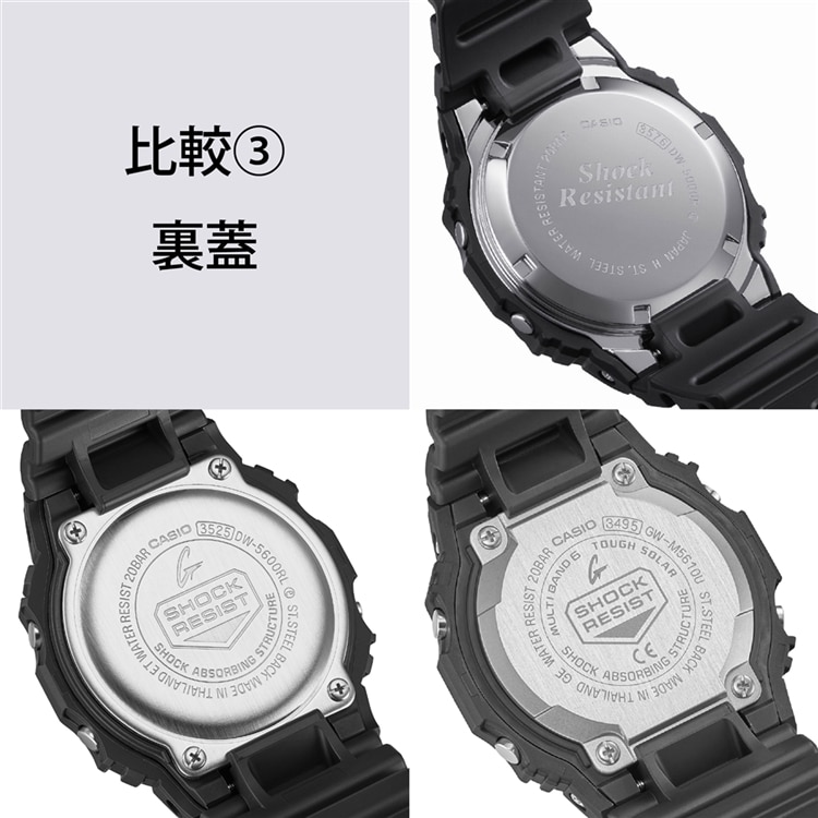 また、「DW-5600RL(左下)」は最も一般的な丸いプレスバック、「GW-M5610U(右下)」はシリーズ特有の削り出しステンレスバックを採用。ケースはどちらも樹脂製であり、モジュール番号(機械の識別番号)や品番、素材などの表記の仕方はほぼ同じです。