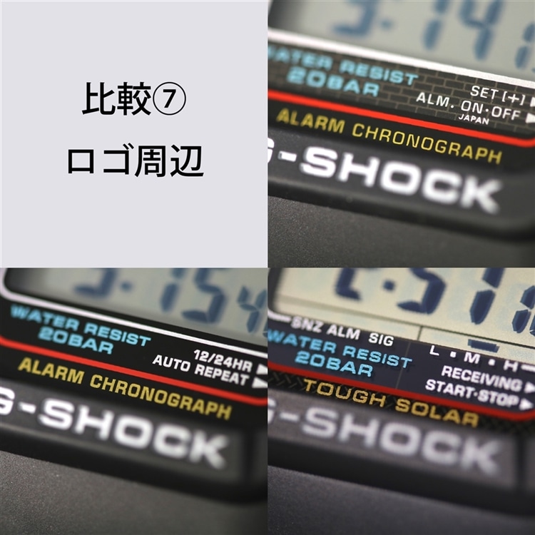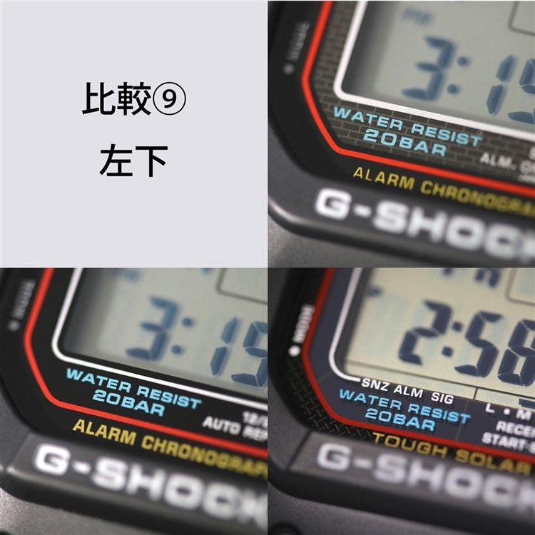 続きまして、ケース左側にズームしてみます。比較⑧左上にある『CASIO』のロゴや「SHOCK REGIST」表記はサイズ、位置ともにほぼ同じ。左上のプッシュボタンもすべてのモデルで「ADJUST●」(時刻調整)用として共通のようです。また、比較⑨左下の「WATER REGIST 20BAR」表記もサイズ、位置ともに同じ。(ピンぼけで見づらく申し訳ないのですが)左下のプッシュボタンも「●MODE」(モード切替)用として共通。違いを探るとすれば「GW-M5610U(右下)」の「SNZ/ALM/SIG」モード表示があること。さらによく見ると、液晶周りの白枠が「DW-5000R(右上)」だけ少しカーブがキツくなっているようです。