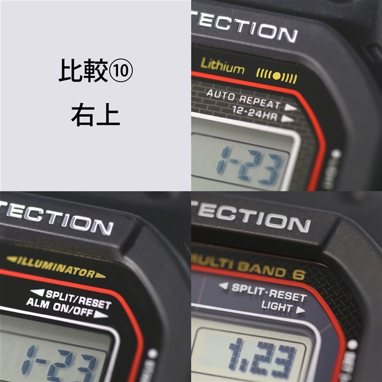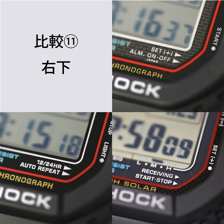 最後にケース右側を比較します。比較⑩右上部分は、「Lithium」「ILLUMINATOR」「MULTI BAND 6」と三者三様の表記に。また、日付部分はサイズに若干の違いがあるうえ、「GW-M5610U(右下)」においてはあの7セグメントフォントではなく、3×5のブロックフォントになっています。ここについては開発者に聞かないと何故かはわかりませんね。比較⑪右下部分については、「GW-M5610U(右下)」は充電量表記がデジタル部分に追加されています。また、白色LEDの「LIGHT」ボタンが「DW-5000R(右上)」と「GW-M5610U(右下)」は右上プッシュボタン、「DW-5600RL(左下)」のみ右下プッシュボタンです。