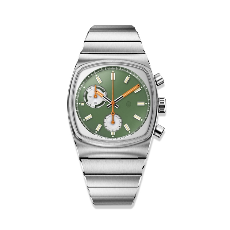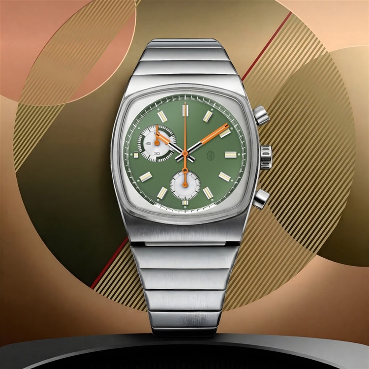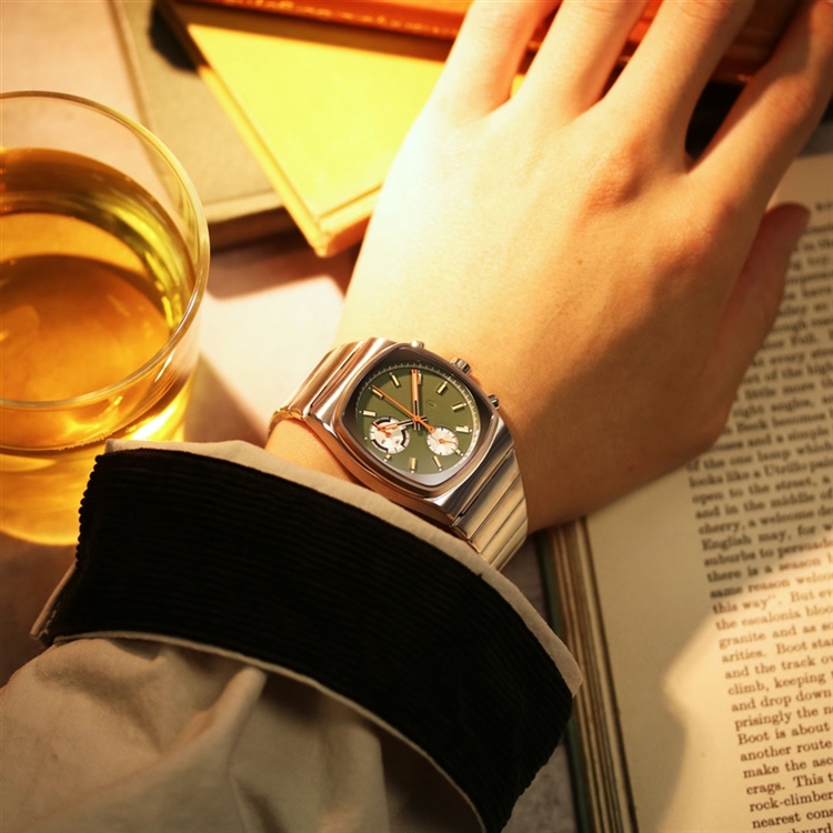 今作は日本の伝統的な【松葉色】や【柳色】を思わせる淡いグリーンをダイアルカラーに採用。針には【橙色】、インデックスには【蒸栗色】のようなマットなベージュカラーを施し、和のテイストを表現しています。ブランドコンセプトである“Brew time”(エスプレッソの適正抽出時間である25~35秒)はインナーリングのカラーを反転させた仕様に。