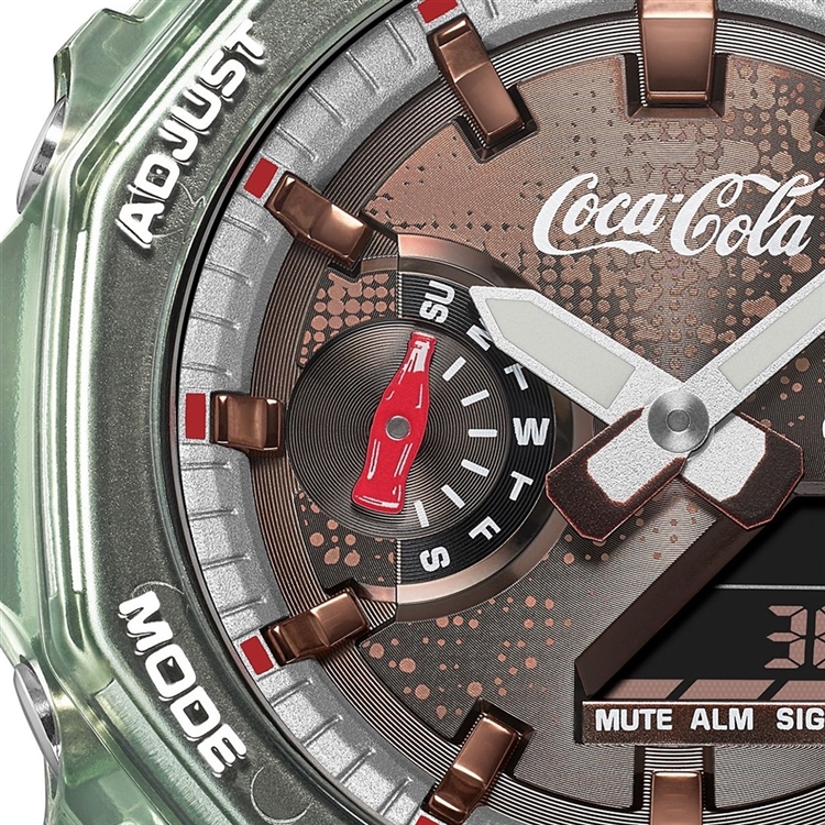 曜日を示す9時位置の小針と遊環部分にはコカ・コ―ラの瓶のモチーフが!特に小針はイラストチックなボトルデザインに、G-SHOCKとコカ・コーラの共通カラーである赤を取り入れた遊び心あるデザインに。